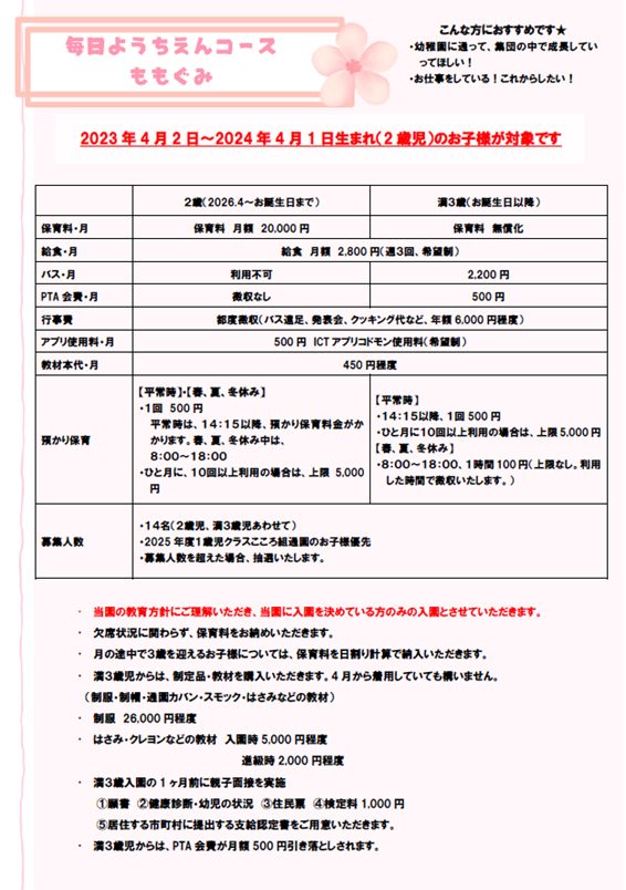 ⭐もも組(2歳児・満3歳児) ~ 14名募集(内、優先入園者含む)
