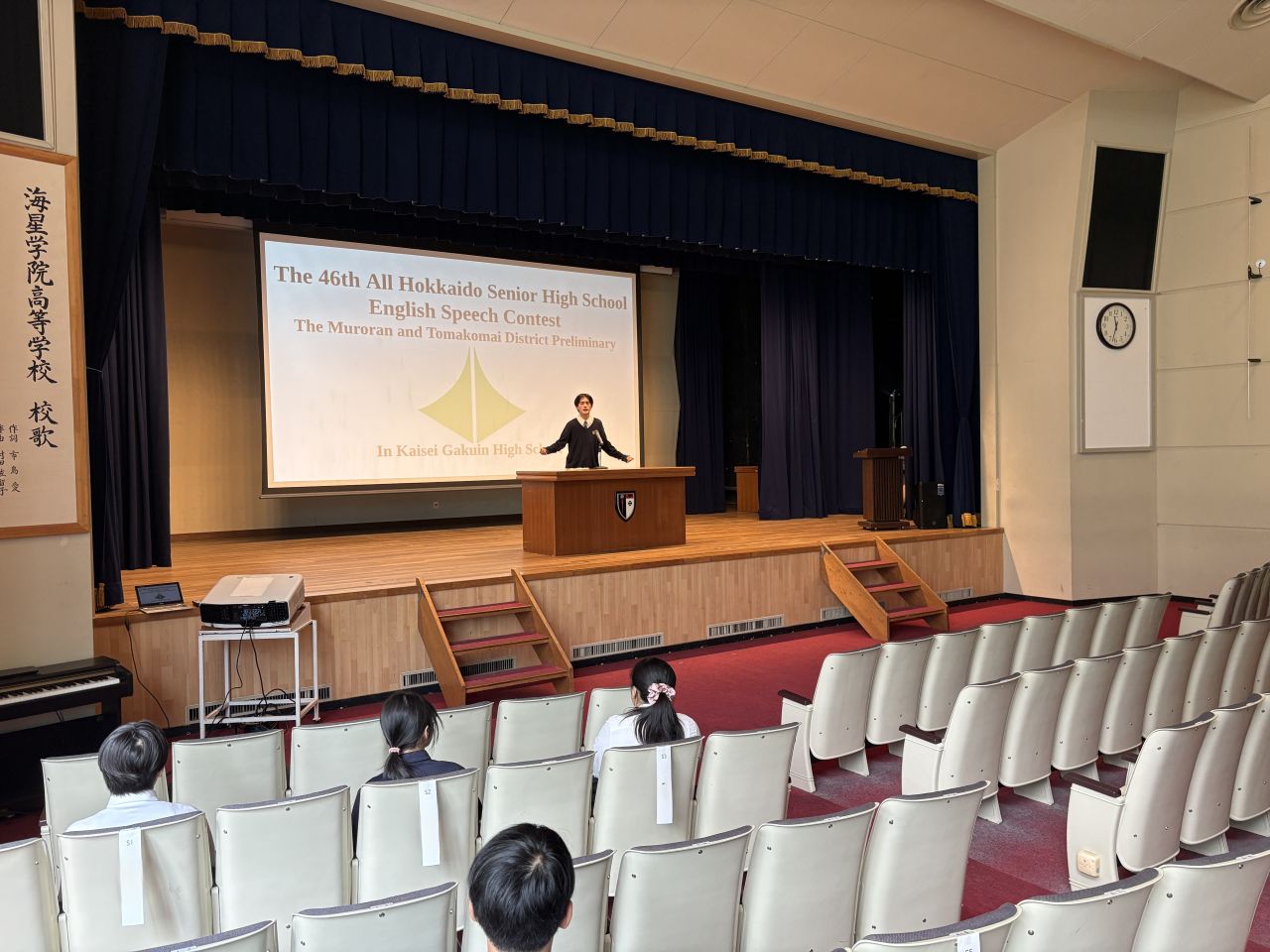 本校は当番校として大会運営を担い、生徒が英語で司会を務めるなど、スムーズな進行に大きく貢献しました。競技では、本校2年生の岩ケ谷さんが見事優勝し、10月に開催される全道大会への出場権を獲得しました。さらに、1年生の加藤さんも5位入賞と健闘しました。特に審査員からの英語による質疑応答では、自分の言葉で堂々と答える姿が見られ、これまで授業内で積み重ねてきた英語によるQA練習の成果が大いに発揮されました。