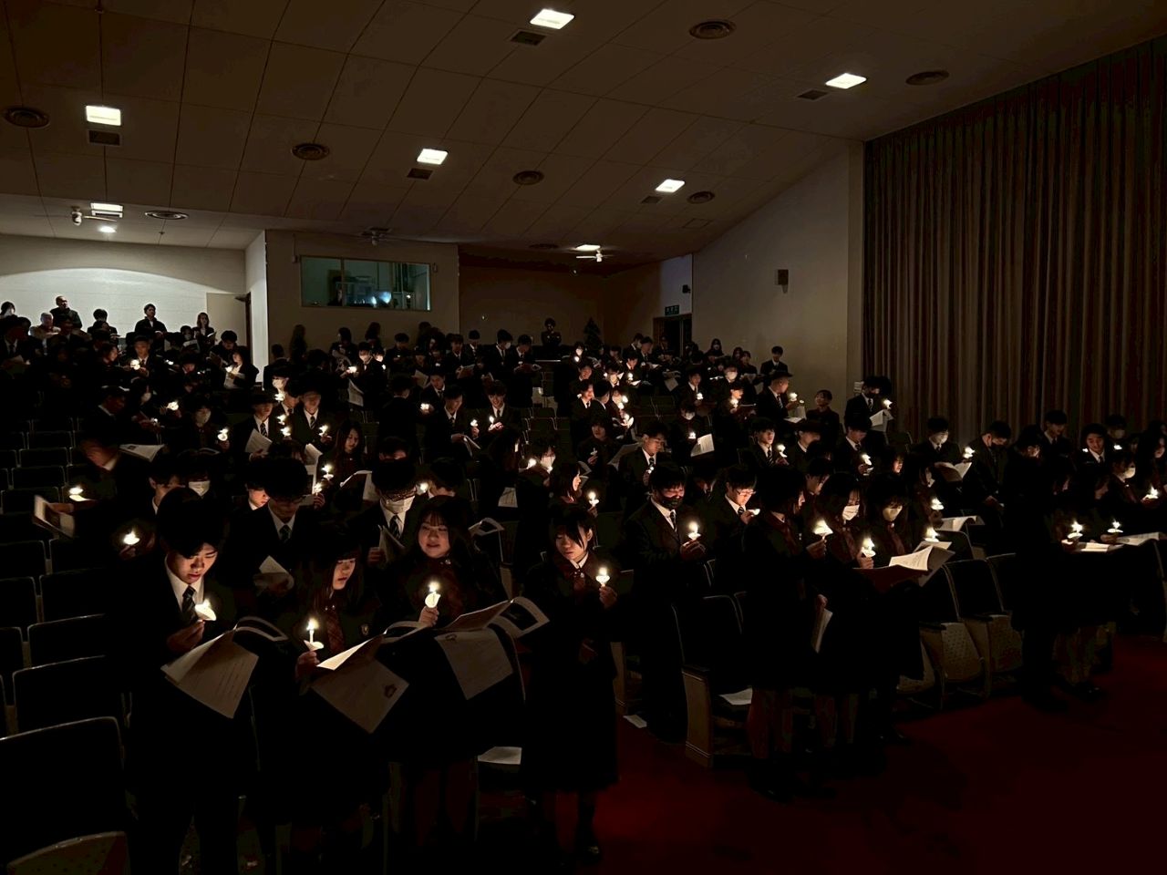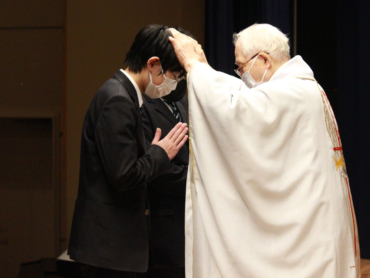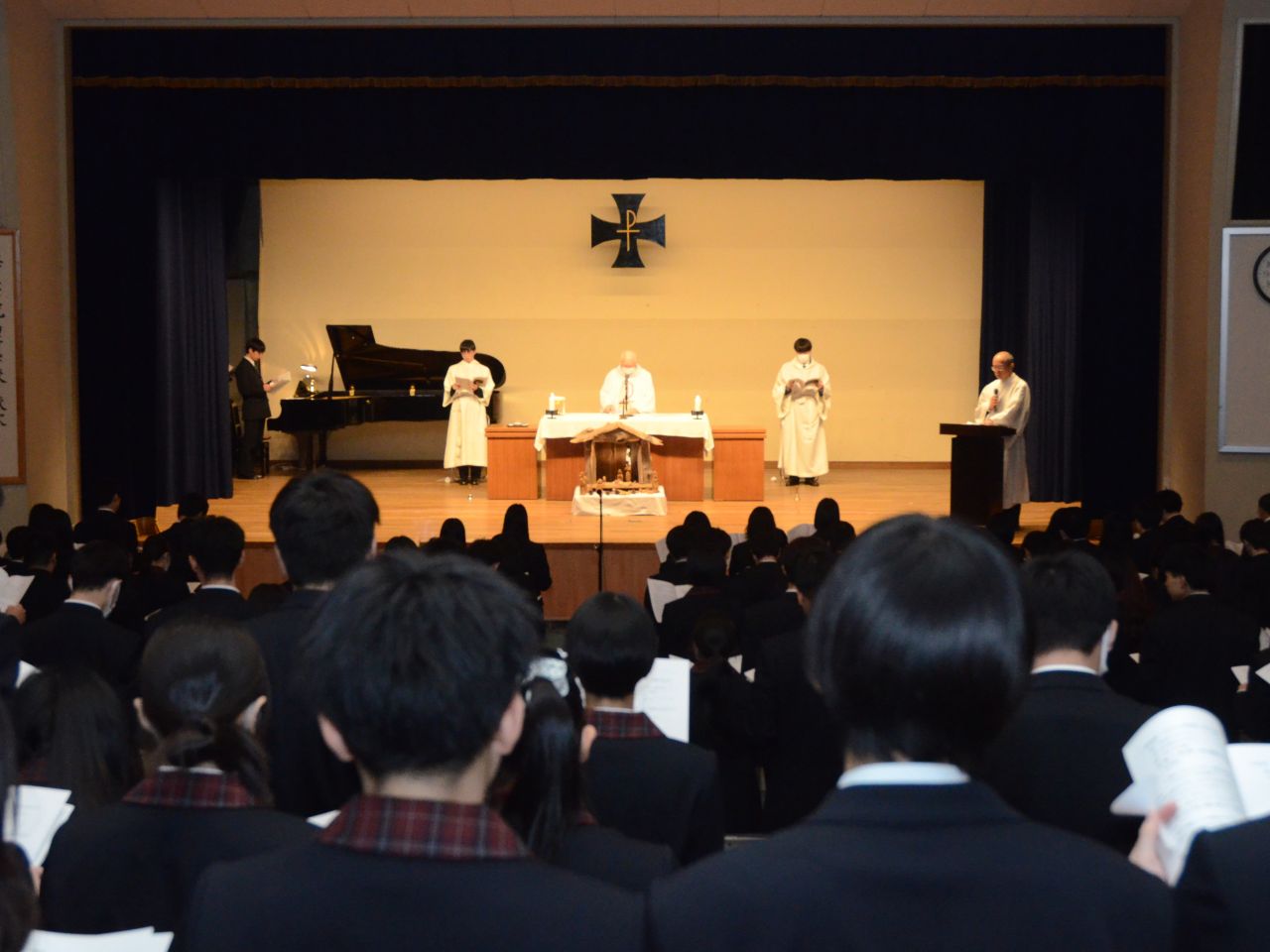 12月22日、クリスマスミサが小林神父様司式のもとベネディクトホールで行われ、全校生徒がこれに参加しました。ミサは、校訓である聖句「世の光となれ」を思い起こすキャンドルサービスで始まりました。キリストの生き方に倣う聖フランシスコや聖マザーテレサについての神父様のお話を通じて、生徒は他者に奉仕することと自分を愛することの大切さについて理解を深めることができました。また、聖誕を祝い感謝する3年生代表の共同祈願を通じて、皆で心を一つにして祈ることができました。最後に小林神父様から一人ひとり祝福を頂き、生徒は思いやりをもって自分の道を歩もうという気持ちを強めることができました。