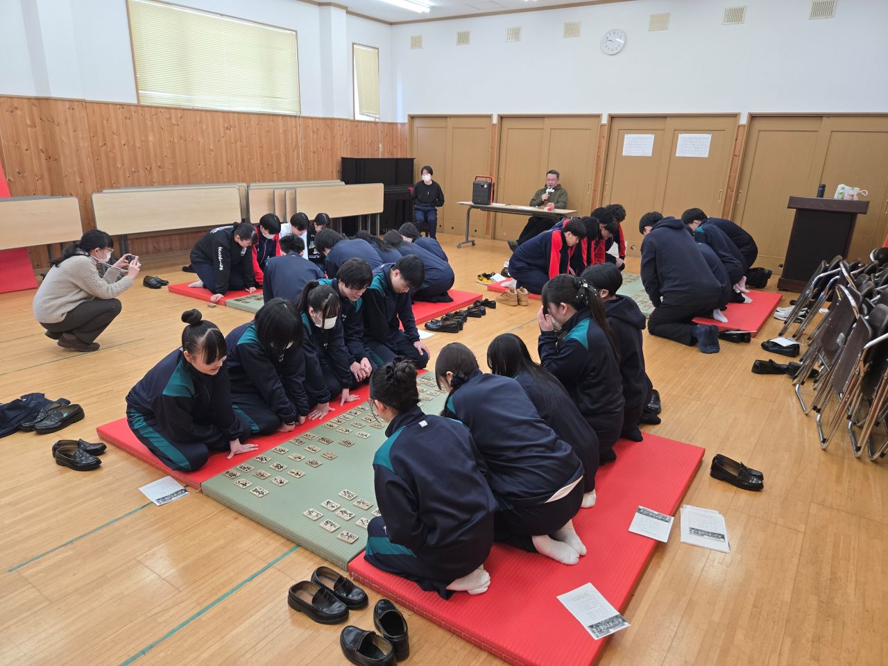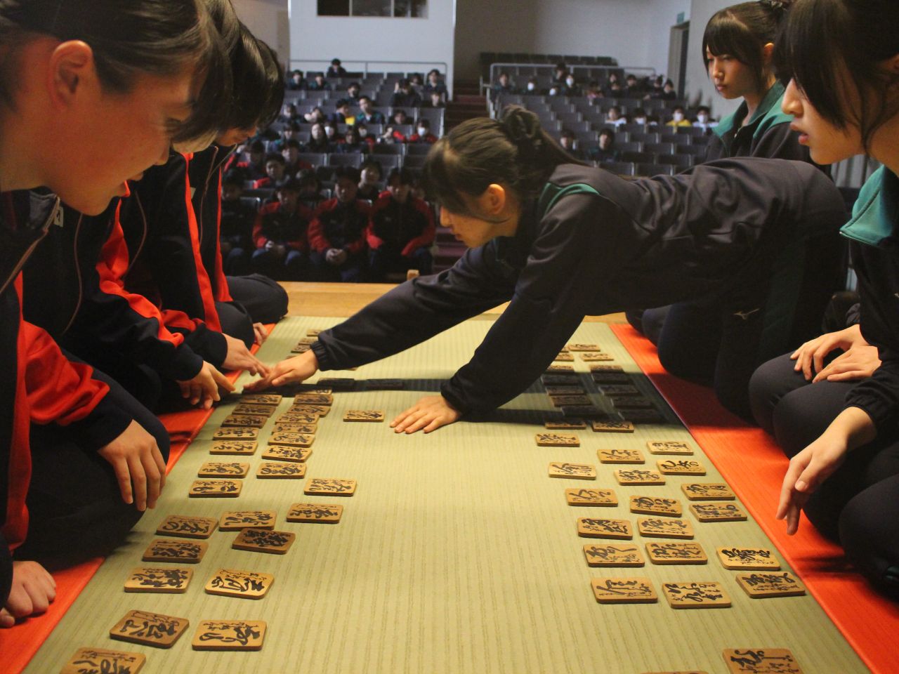 本校のかるたは、道内で一般的な下の句かるたとは異なり、上の句を詠み上げて下の句の札を取る形式で行われます。最多で10人が一斉に札を取り合うため、暗記力だけでなく、和歌の意味を理解する力や集中力も求められます。
