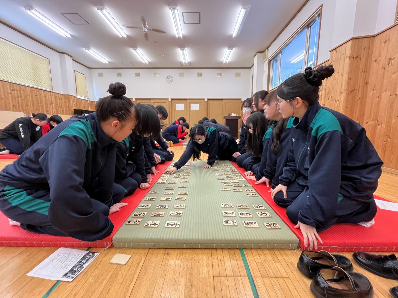 生徒たちは昨年12月から授業を通して百人一首の学習と練習を重ね、本大会に臨みました。大会では学年ごとに予選リーグを実施し、20チームのうち上位8チームが決勝トーナメントに進出しました。決勝トーナメントでは、2年生チームに加え、1年生チームも健闘し、白熱した試合が繰り広げられました。